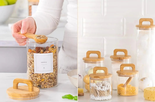 Premium Glass Jar Set - 5 Canisters with Airtight Bamboo Lids, Custom Labels & Spoons